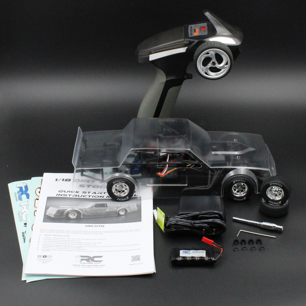 The body of the 1RC Racing Dirt Street Stock comes clear, allowing racers to customize it in their favorite colors. The close-wheel design adds excitement to racing, enabling competitors to bump each other as they race to the checkered flag. The Hoosier-branded tires are mounted on chrome racing wheels, providing an authentic look and excellent traction. Additionally, included with the Dirt Street Stock is a spare set of soft compound rear tires for improved rear traction if needed.