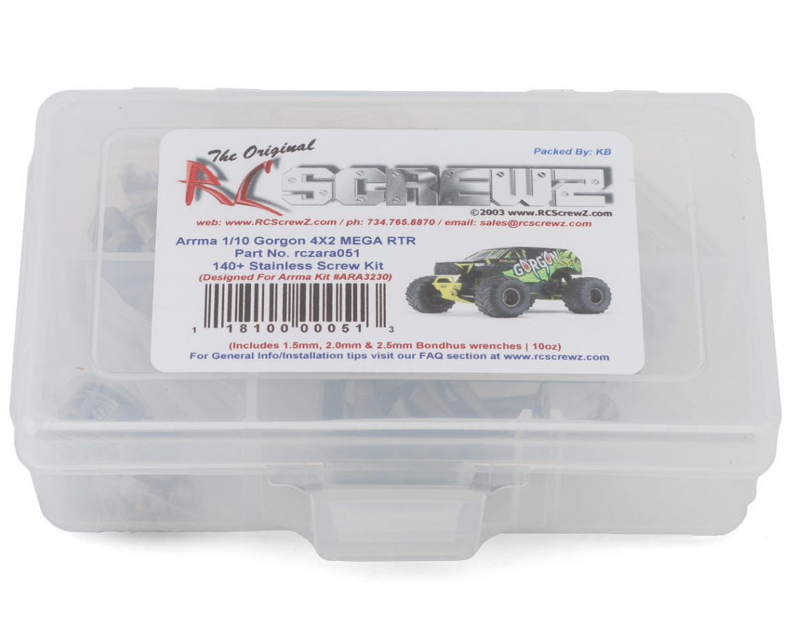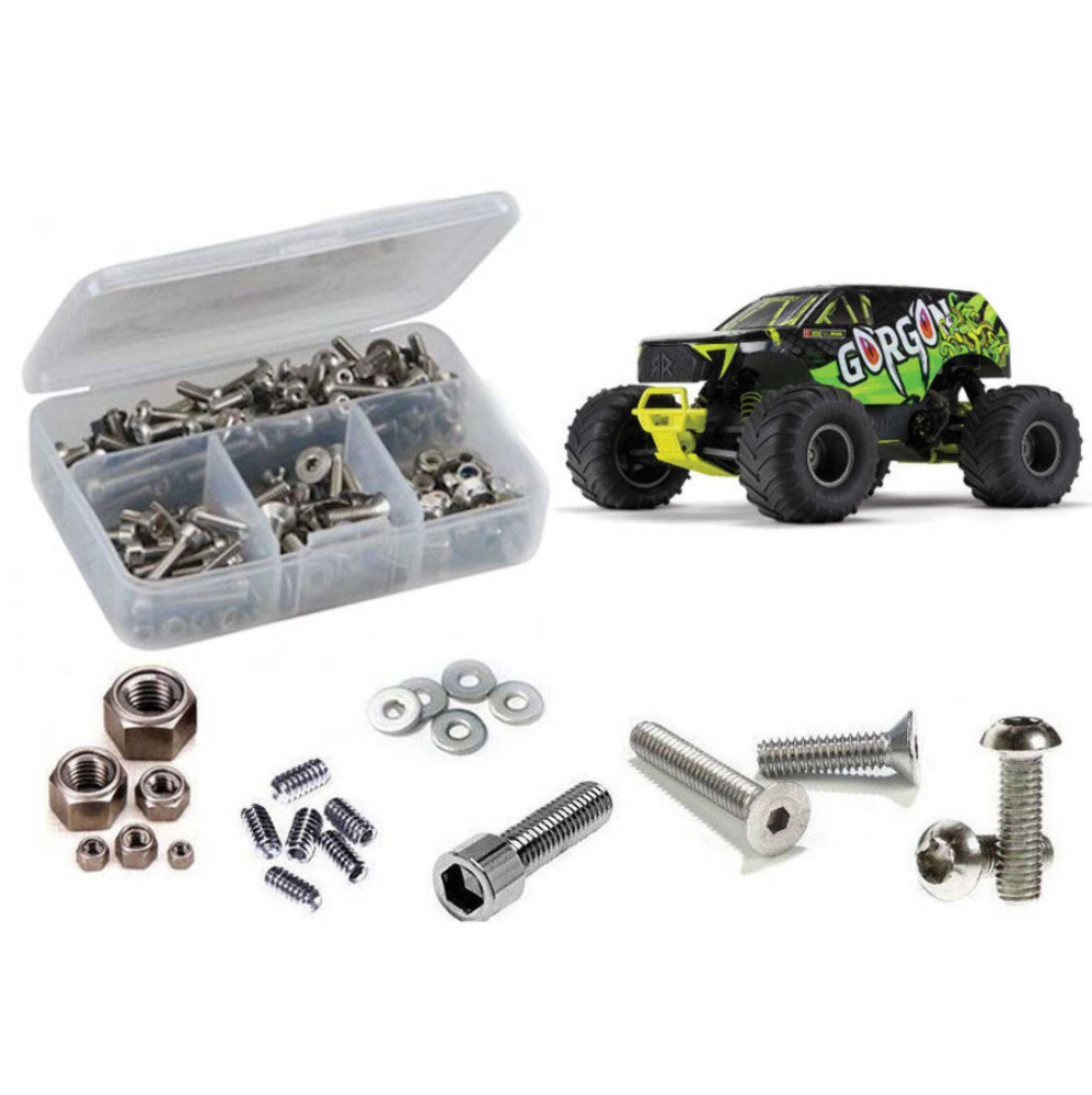 This is an optional RC Screwz Stainless Steel screw kit for the Arrma Gorgon 4x2 MEGA 1/10 Monster Truck. RC Screwz Stainless Screw Kits are 100% complete. Your kit will include everything needed to do a full conversion and more. Stainless Steel Screw Kits are far superior to the screws that come stock with your RC. RCScrewz kits are made with the best stainless steel money can buy. No more bent, rusted, or corroded screws. Never worry about stripped heads again. You will not find a better screw kit for your RC at any price and RCScrewz Guarantee it.