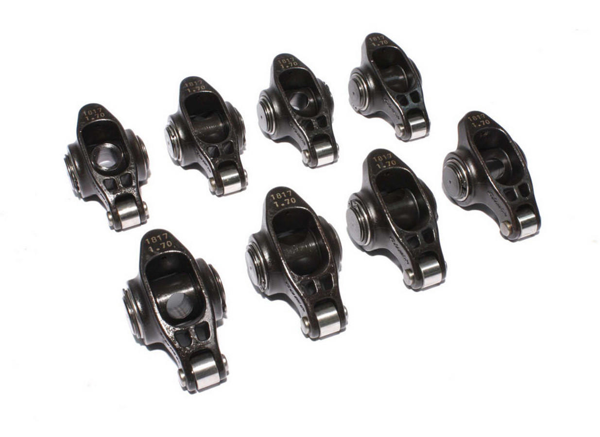 Part #1808-8* represents a set of eight rockers tailored for Chevy Small Block V8 engines within the 265-400 cubic inch range. Featuring a 7/16" stud and a 1.55 ratio, these rockers are engineered to withstand up to 1000 lbs of open spring pressure. The billet pushrod seat insert, precision-sorted needle bearings, and advanced FEA/CAD development collectively contribute to unmatched accuracy, strength, and longevity.