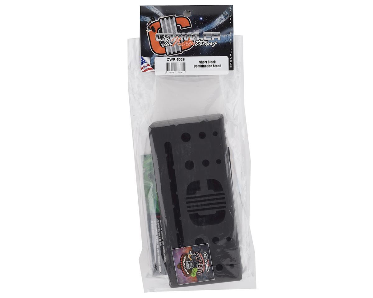 The Crawler Innovations Short Block Combo stand is custom machined from ultra dense, closed cell foam. It features Four - .250" holes, Four - .375", and Four - .500" holes that can be used for holding tools, building or rebuilding shocks, or anything else that fits. The large opening is 7.00" wide and is shaped to hold a cell phone, tablet, or electronic device while the user listens to music, watches a video, or it can be used as a stand to film from. The Short Block Combination Stand has the Crawler Innovations Icon machined into the center.