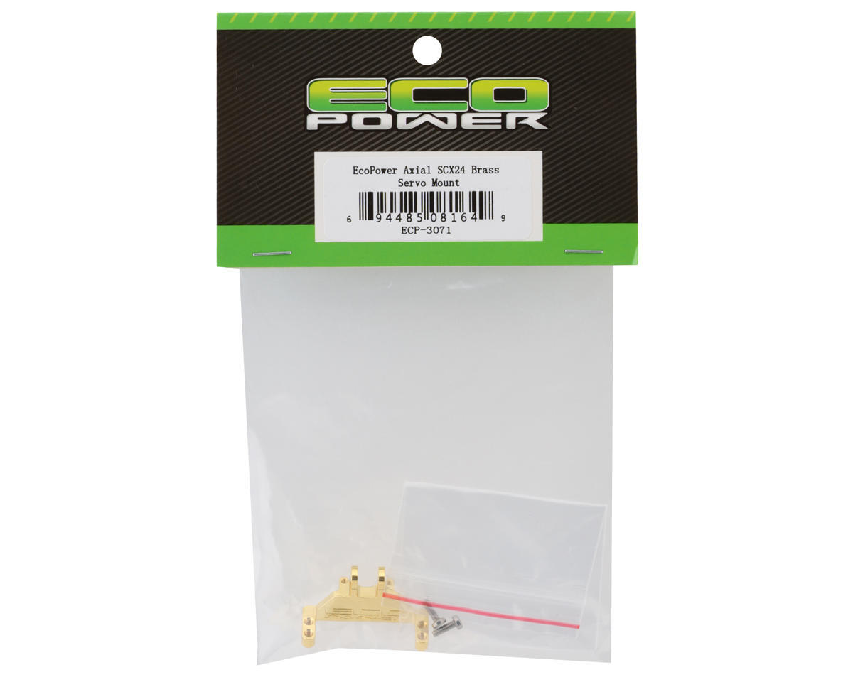 Eliminate unwanted flex found in stock composite mount and enhance your Axial SCX24 steering precision and performance with this innovative EcoPower brass servo mount. Constructed from high-quality brass for a precision fit and designed to fit the EcoPower 827 micro servo and compatible with front and rear SCX24 axles for optional 4-wheel-steering conversion. This optional servo mount is the ultimate upgrade for your SCX24 platform and a must have for high torque servos! With its stylish shiny gold colored plating and the CNC machined EcoPower logo and stainless steel hardware, this servo mount will look as good as it performs and add bling to your ride!