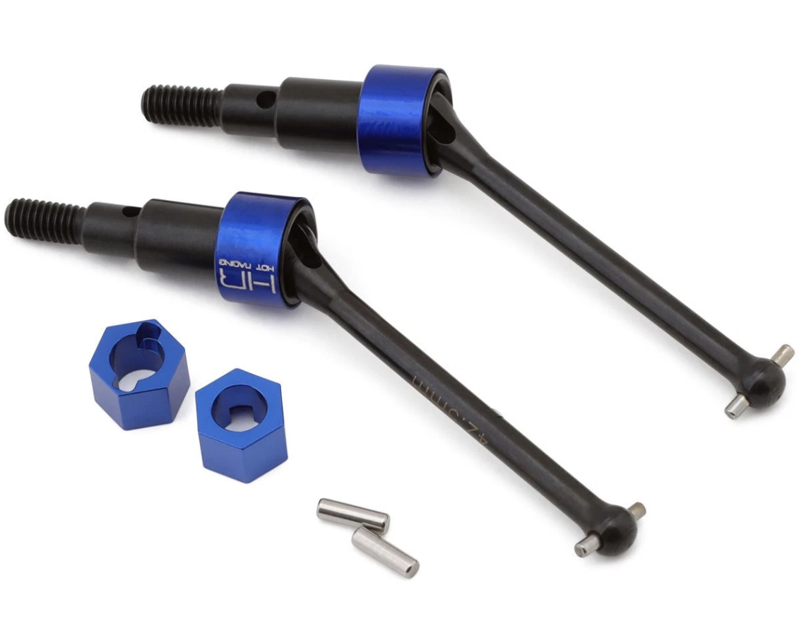 Designed with heavy-duty CNC machined steel wheel stub shafts and aluminum clamp-style hex hubs, this narrow front axle set replaces the stock CVD dog bones and plastic shafts for improved strength and reliability. The set comes pre-assembled for quick installation and is compatible with setups using ARA330839 front arms and 330841 knuckles.