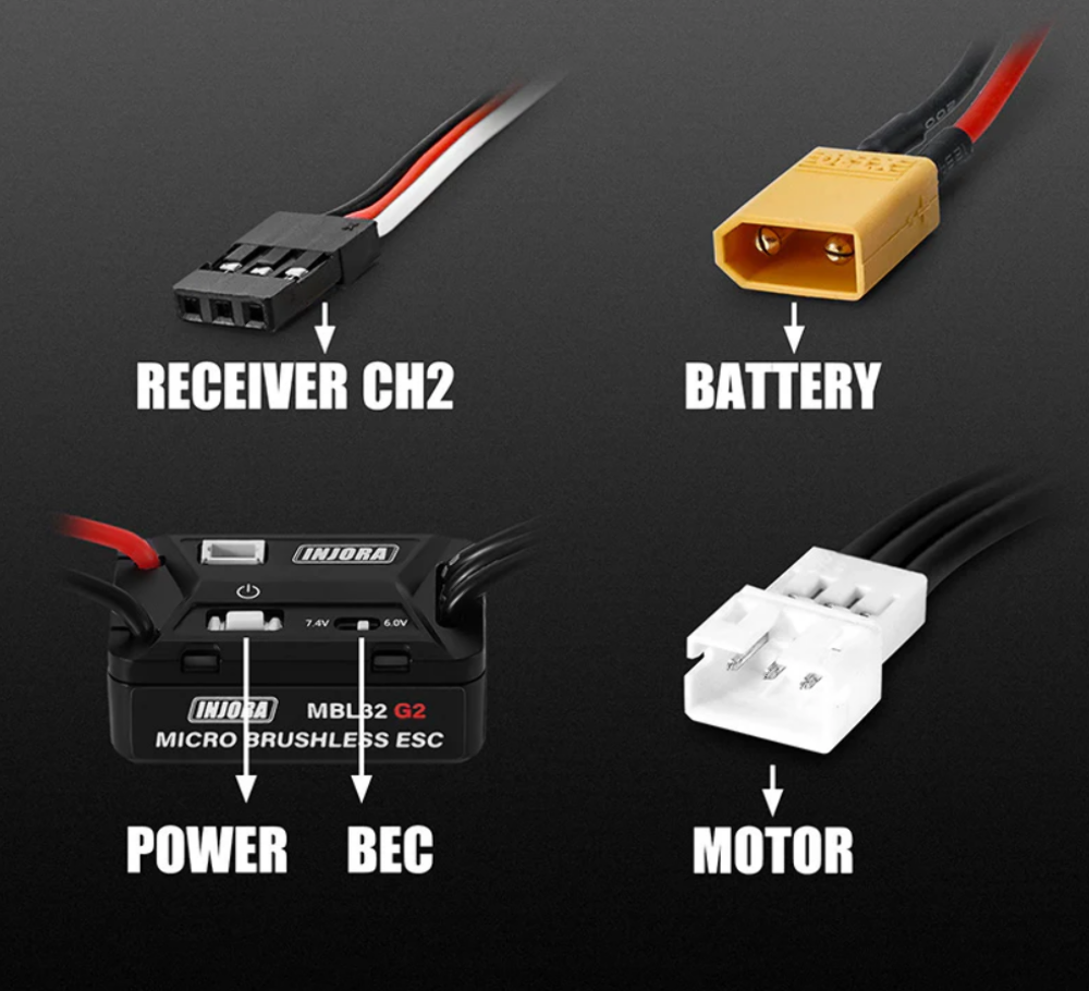 - Supports PC Programming via USB programmer card. Factory settings are optimized for INJORA 1721/2204 motors—adjustments are not recommended.