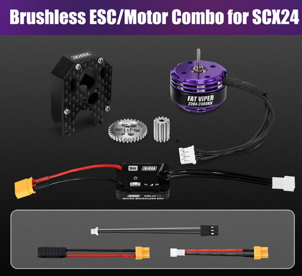 - Chassis: Compatible with INJROA SCX24 LCG carbon fiber chassis. For stock SCX24 chassis, the ESC tray must be trimmed to fit the motor.
