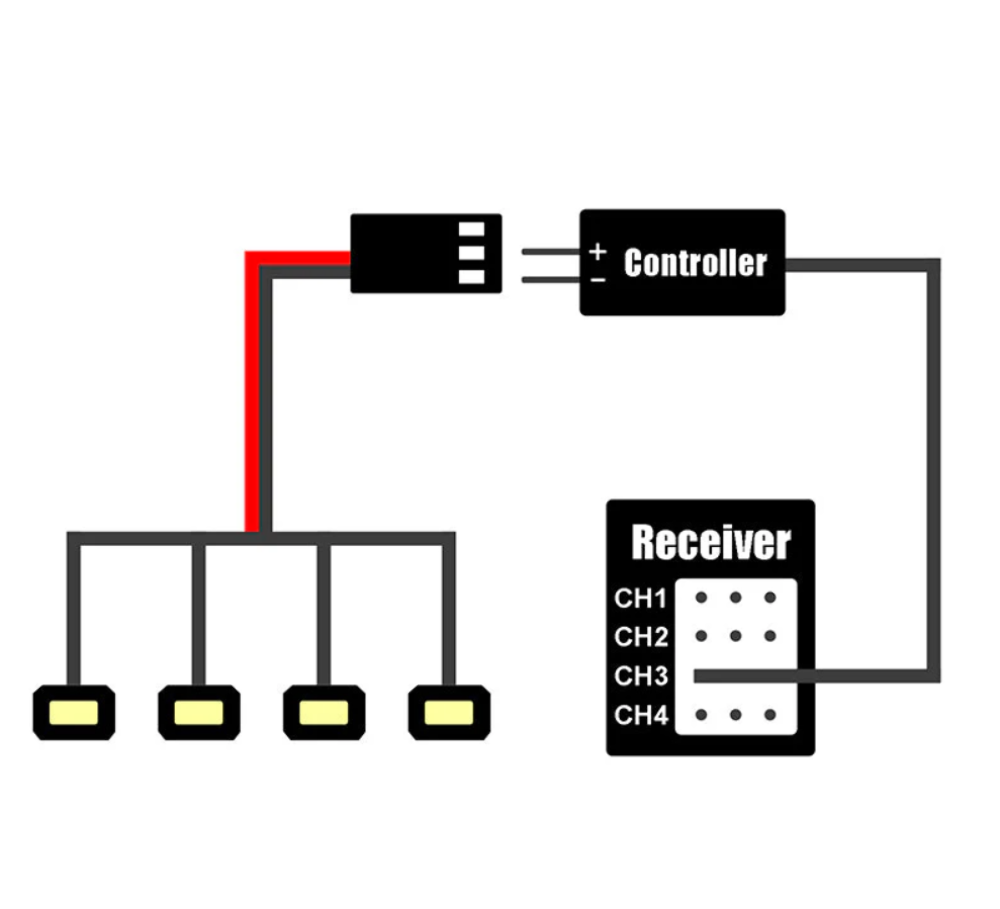 - Remote: Plug it into a CH3(or CH4) and then you can use the buttons on your transmitter to remotely control the light to switch modes.