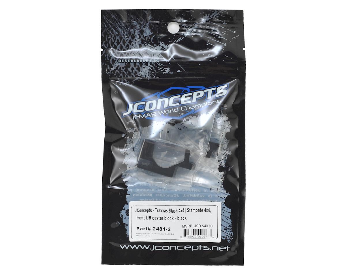 JConcepts Traxxas Slash 4x4/Stampede 4x4 Caster Blocks take the Slash 4x4 and Stampede 4x4 caster block design to the next level. The design boasts all aluminum construction with revised geometry to maximize clearance specifically for the JConcepts (JCO2477) suspension parts set. The designers were able to trim a little weight off the ears, improve wheel clearance and position the camber link in just the appropriate location for bashing and thrashing a monster truck rig.