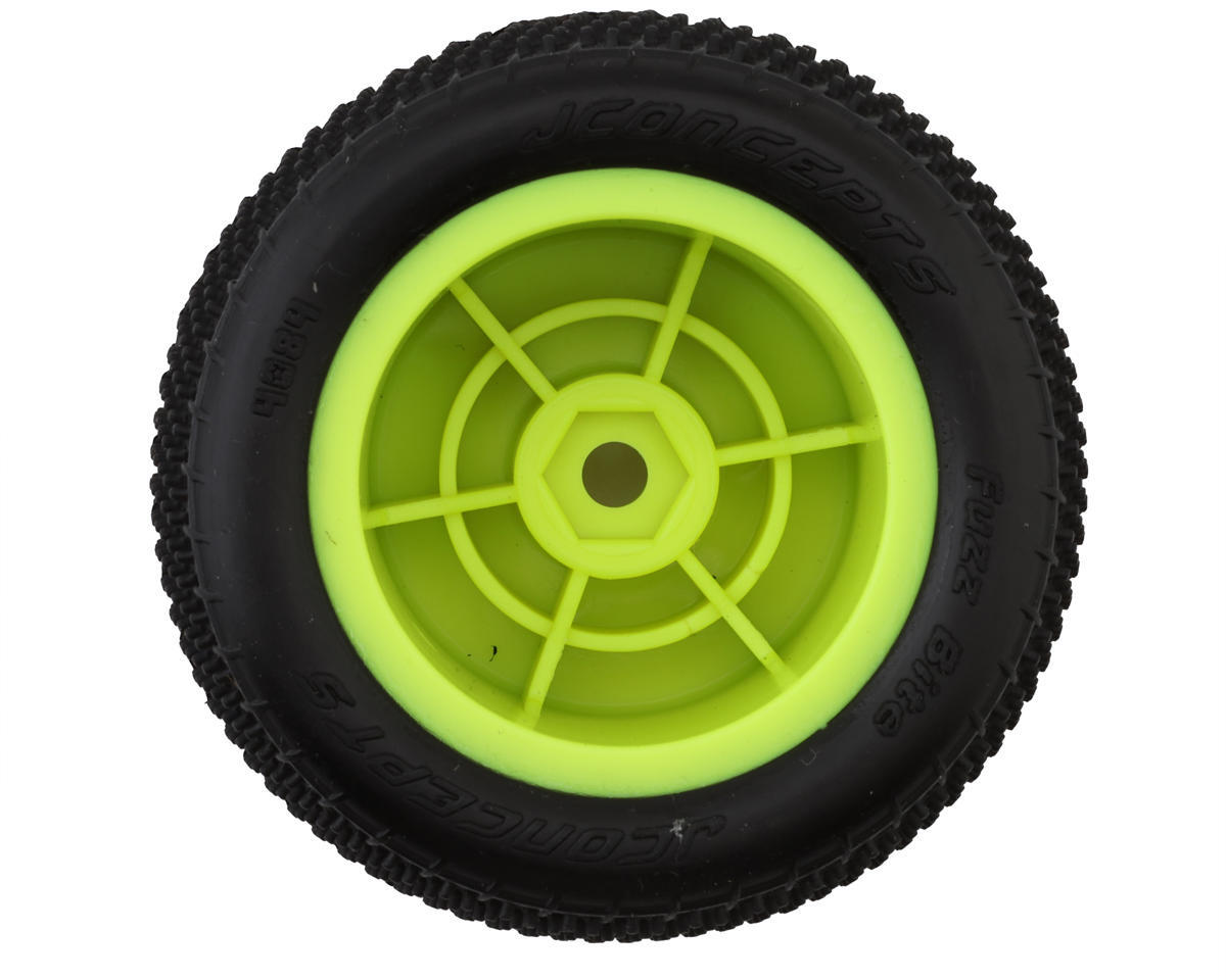 JConcepts Mini-B Fuzz Bite Pre-Mounted Rear Tires. The Mini-B Fuzz Bite Pre-Mounted Rear Tires from JConcepts represent a pinnacle of innovation in the realm of carpet and turf racing. With the racing scene becoming increasingly competitive and diverse, JConcepts has responded with a tire specifically engineered to excel on a variety of surfaces. The key feature of the Fuzz Bite tires lies in their unique pin design, which is strategically positioned in a reverse "water tower" shape. This design ensures optimal traction and precision handling by maximizing the contact patch while minimizing side-wall deflection and roll. The pins are arranged in a radius pattern, providing a dense nest of pins that effectively dig into the surface, whether it's office carpet or tight-knit CRC carpeting, offering exceptional grip and stability through corners and straights.