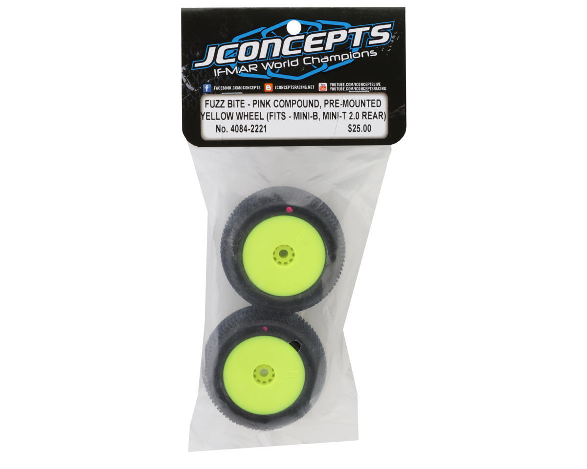JConcepts Mini-B Fuzz Bite Pre-Mounted Rear Tires. The Mini-B Fuzz Bite Pre-Mounted Rear Tires from JConcepts represent a pinnacle of innovation in the realm of carpet and turf racing. With the racing scene becoming increasingly competitive and diverse, JConcepts has responded with a tire specifically engineered to excel on a variety of surfaces. The key feature of the Fuzz Bite tires lies in their unique pin design, which is strategically positioned in a reverse "water tower" shape. This design ensures optimal traction and precision handling by maximizing the contact patch while minimizing side-wall deflection and roll. The pins are arranged in a radius pattern, providing a dense nest of pins that effectively dig into the surface, whether it's office carpet or tight-knit CRC carpeting, offering exceptional grip and stability through corners and straights.