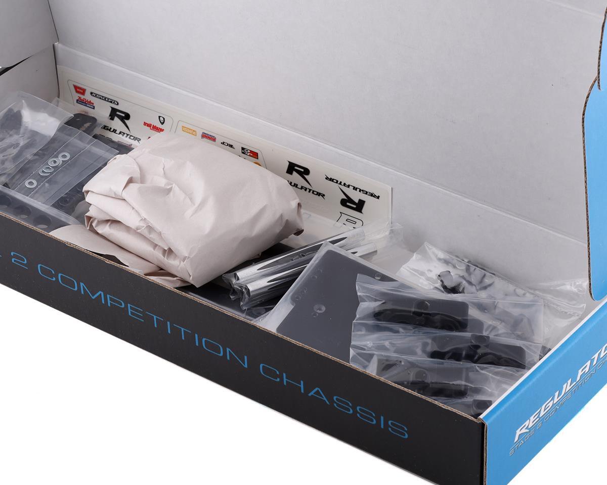 Machined and adjustable Delrin body posts are included along with pin screws to attach to the aluminum shock and body mount part providing a height adjustment. The battery mounting system contains a fiberglass battery strap for a shorty style battery with bump stops on each end to hold the battery positioning on the radio tray. Finishing off the panels of the chassis, polycarbonate pieces are included and can be trimmed to slide into the pockets of the chassis to give scale looks. Trim and position the included decal sheet on the panel to detail out the sides of the Regulator to fit whichever theme suits the build.