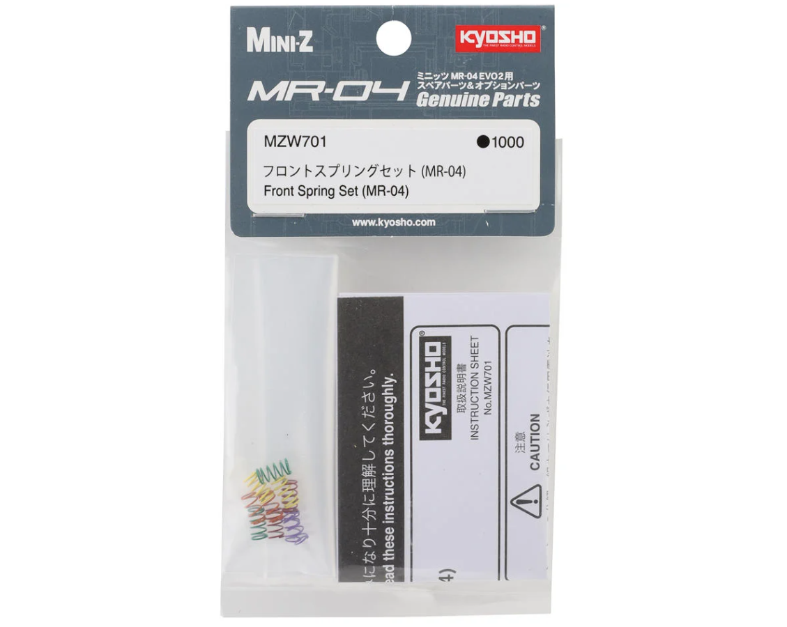 Fine-tune the steering characteristics of your micro-racer with this Front Spring Set. Designed specifically for the new Mini-Z MR-04 EVO2 chassis, these springs are the primary tool for adjusting how your car enters and exits corners.