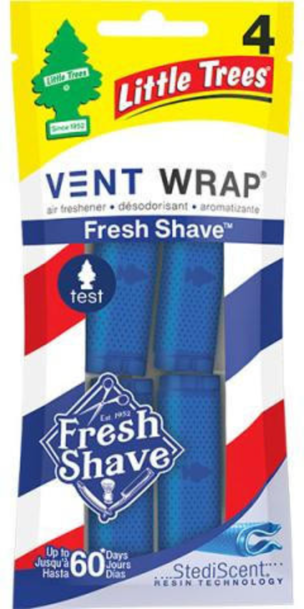 As the global symbol of freshness and quality, Little Trees air fresheners have been making life smell better since 1952. Fresh Shave Scented Vent Wrap provides a premium fragrance that delivers long lasting results in the home, office, or on the road! Qty 1 - 4 pack sleeves - 4 total vent wraps!\n - Make your car Invisibly Fresh with Little Trees Vent Wrap – an air freshener that blends in with a scent that stands out.