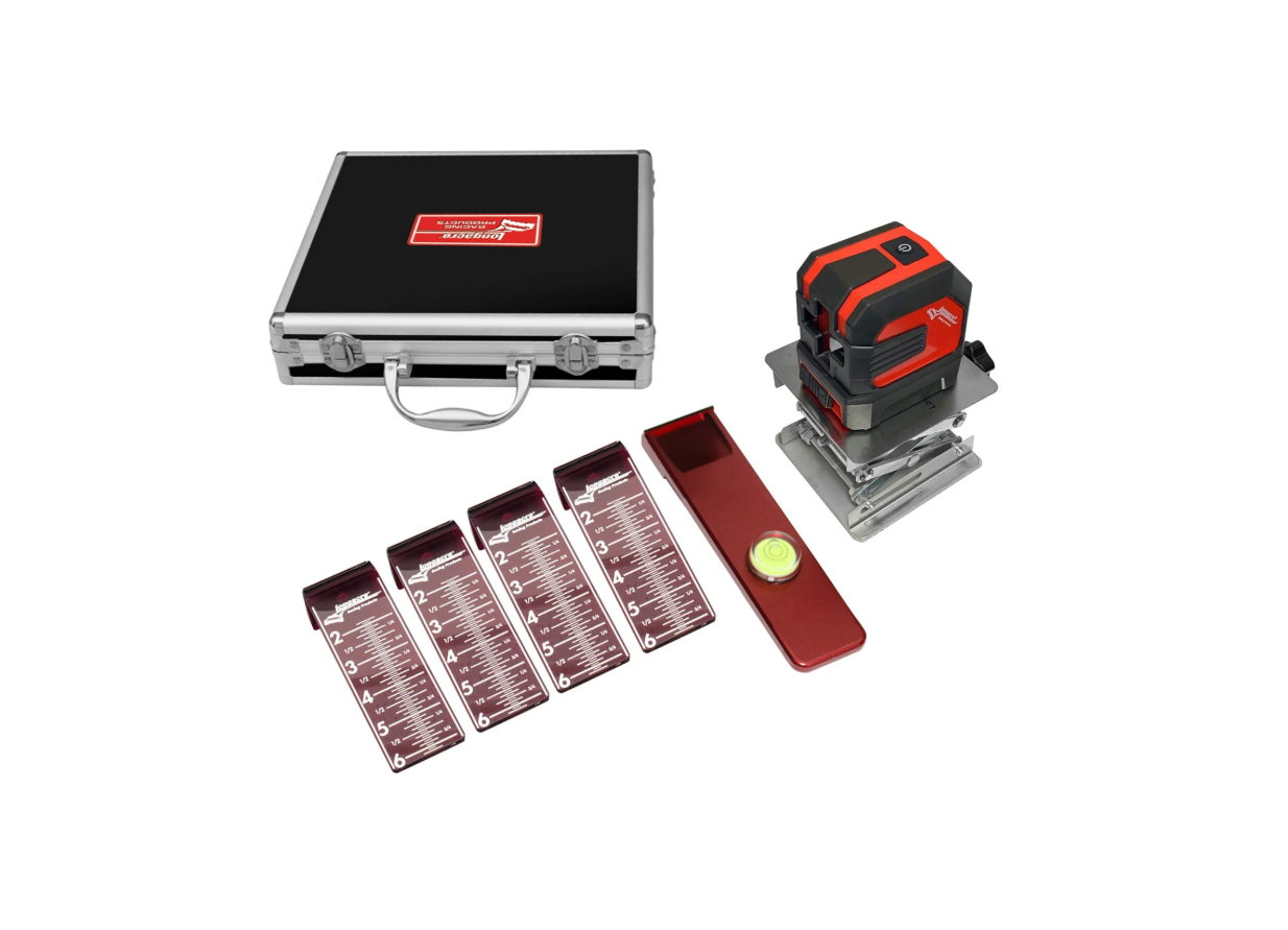 - Includes an easy to setup self-leveling beam laser, 4 easy to read targets that are held to the frame with magnets and a separate pad leveling target for leveling the scale pads and establishing the 'ground plane' to measure chassis heights.