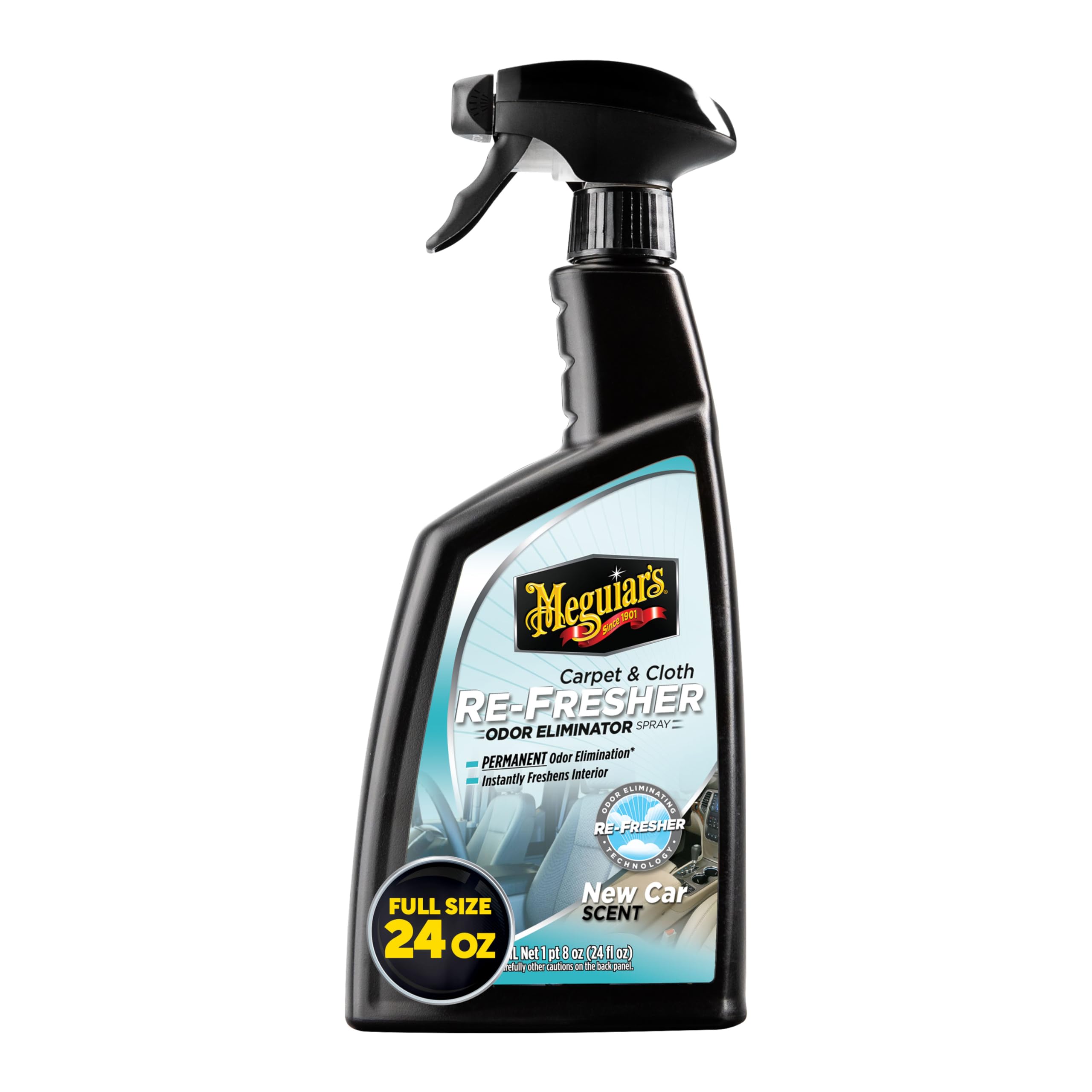 Say goodbye to unwanted odors with Meguiar’s® Carpet & Cloth Re-Fresher, the ultimate solution for refreshing your car’s interior. Whether it’s smoke, pet accidents, or lingering spills, this powerful formula permanently eliminates odors* through advanced Re-Fresher technology that works at a molecular level. Simply spray it on, and the foul odors are gone – replaced with the fresh, clean scent of New Car.