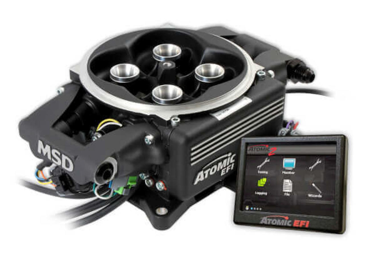 Unleash the power of your engine with the Atomic 2 EFI system from MSD, featuring four 100LB/HR Fuel Injectors that can support up to 650 HP naturally aspirated or 635 HP on forced induction applications. The Atomic 2 ECU introduces fuel map self-learning and ignition timing control, enhancing idle stability, drivability, and wide-open throttle horsepower. Specifically designed to fit on a 4150 intake manifold, it provides ample clearance for factory air cleaners.