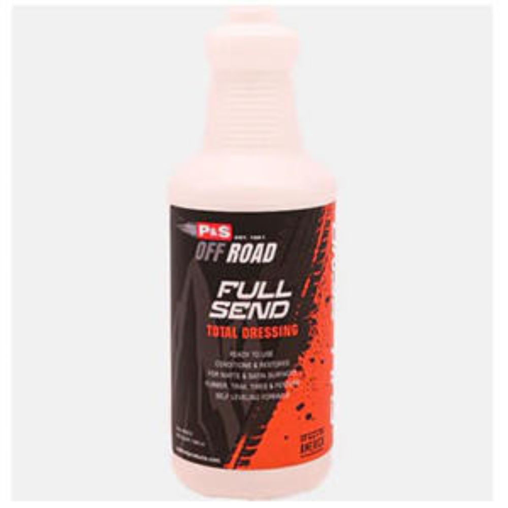 The P&S Full Send Total Dressing Bottle is the perfect product to pair with This bottle is color-coded and pre-labeled as "Full Send", so you will never confuse this product for another. On the back of the label P&S lists application steps along with safety info. This bottle does not come with a trigger but the DI Accessories Chemical Resistant Spray Trigger is a perfect fit. The bottle is 32 ounces. If you are looking for an easy way to dilute or simply use your Full Send Total Dressing in a small bottle, the P&S Full Send Total Dressing Bottle is a great product to pick up.