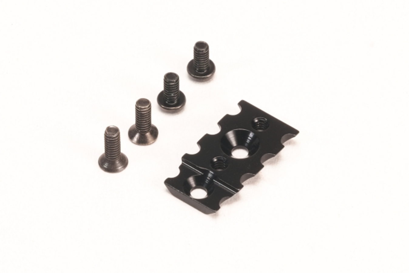 Countersunk crews are inserted one adjustment position after of T-Plate screw hole. Therefore, chassis with stripped holes for T-Plate can be salvaged with this T-Plate Mount that use a different hole location