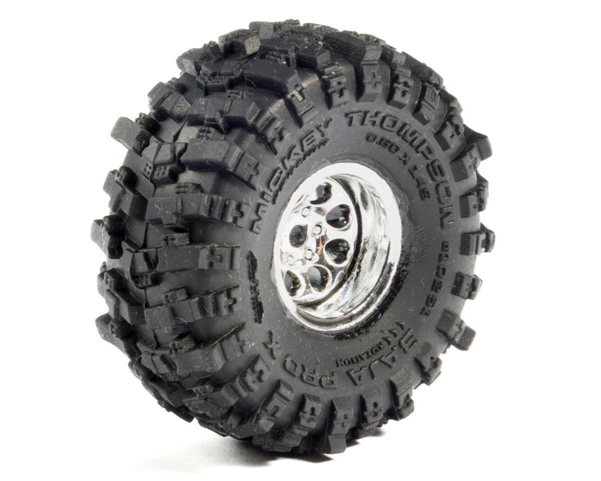 Officially licensed Mickey Thompson Baja Pro X tires pre-mounted on Pro-Line Beast wheels give the Axial SCX30 unstoppable, ready-to-run performance with authentic scale style. The sticky rubber compound, deep lugs, sidebiters, and mud scoops deliver confident grip across rocks, sand, snow, mud, and grass, while the retro 8-hole chrome Beast wheels add classic off-road flair. Pre-glued for hassle-free installation, this combo is a perfect upgrade for drivers who want maximum traction, true-to-life detail, and instant performance in one package.