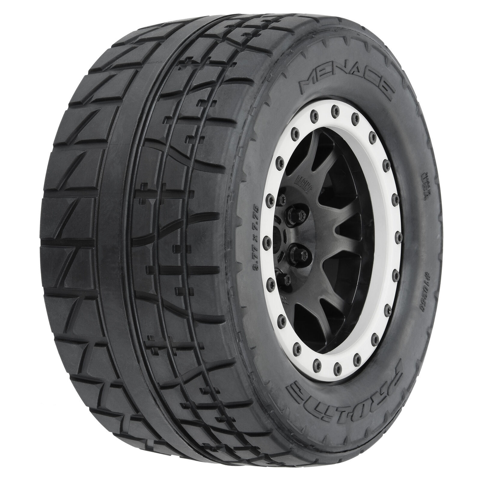 This is a pair of Menace HP 4.3" tires. Pro-Line has taken our belted tire & wheel combination for X-MAXX® to the next level with our highest-performance street tire ever: The Menace HP mounted on Impulse 4.3" Pro-Loc Wheels! Pro-Line Menace tires are 1:1 racing-inspired tread designed to give your rig massive traction on your street, parking lot, or track.