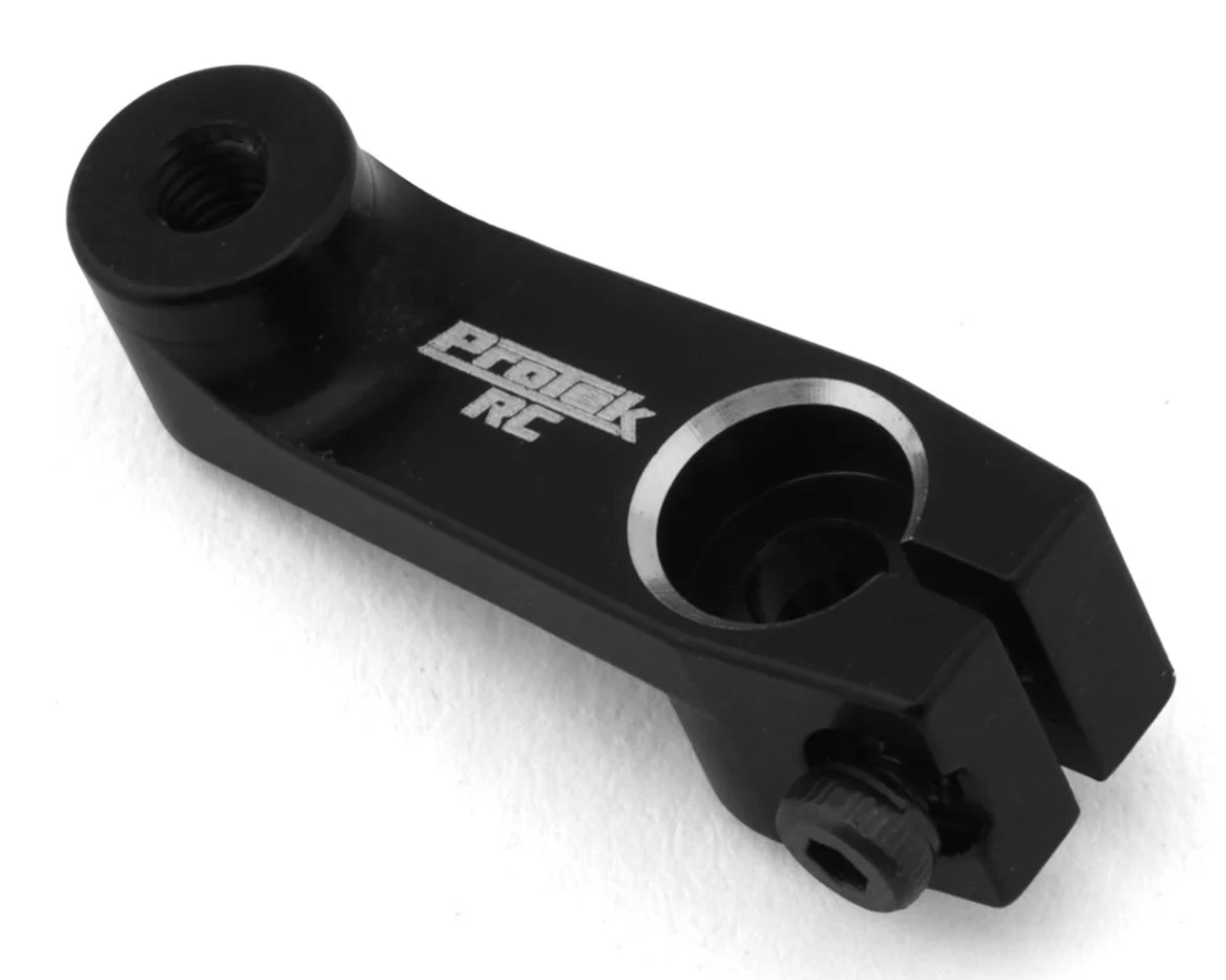 The ProTek R/C Associated B6 and B7 Aluminum Clamping Servo Horn is an updated horn that features a 2mm taller ball stud standoff, compared to the previous ProTek Team Associated servo horn. This horn is machined from a solid block of aluminum alloy and anodized black. The horn has been machined to the exact specifications of the plastic Team Associated ASC91728 servo horn, but provides the precision, rigidity and durability required for the latest generation of high-performance R/C vehicles. Plus, the horn only weighs two grams and provides the security of a clamping design, ensuring the horn remains in place when the retainer screw comes loose.