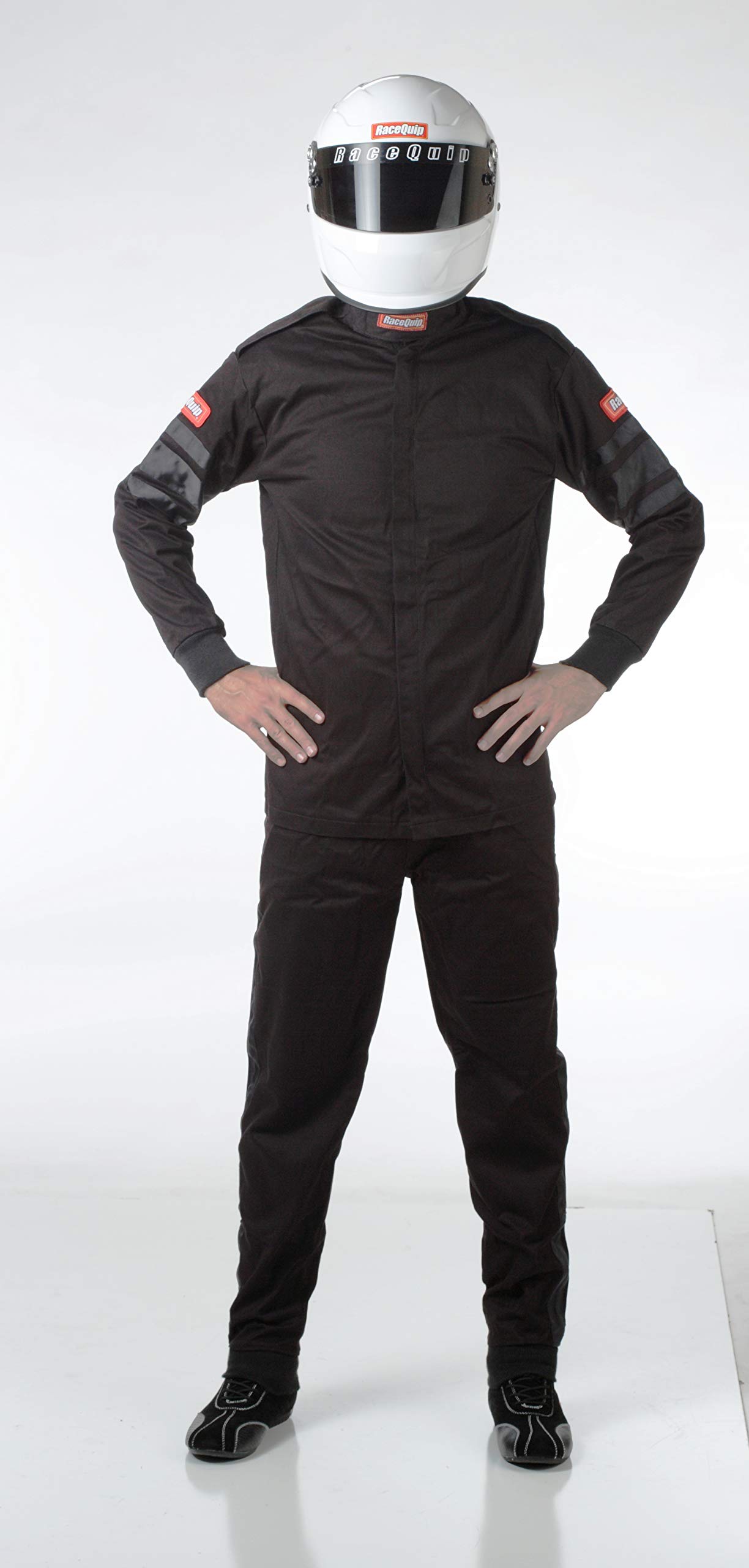 The RaceQuip 111 series single-layer SFI-1 racecar driver`s fire suit jacket is made from Pyrovatex® FRC material. Note that sometimes this material is referred to as ``fireproof``, but actually all auto racing safety gear is ``fire retardant``. Pyrovatex® offers the maximum combination of overall flame and heat protection, durability and comfort for the price. This fire retardant cotton based (FRC) material is used because it retains the softness and breathability of cotton and will wick away moisture from the skin. Pyrovatex® fabric is gentle and non-irritating to even the most sensitive skin. The treatment process leaves the exterior surface shiny and supple. Since the Pyrovatex® process combines a chemical agent with the raw cotton fibers to create a bond at the molecular level, with proper care, the jacket will retain its flame retardant properties beyond the useful life of the garment. All driving jackets are assembled with heavy-duty, multi-needle, over-lock safety stitch machines to provide exceptional seam strength. All RaceQuip jackets feature a high quality heavy duty Nomex® backed brass zipper installed with a double overlap for a more secure front opening. Stylish contrasting armband stripes match the full-length leg stripes found on RaceQuip driving pants. The black accents: high-back collar, arm cuffs, and epaulets give the RaceQuip driving jacket an unique look and style. Add to this the pleated back panel for freedom of movement, and you have a single layer racing jacket that provides an outstanding value. Exceeds SFI 3.2A/1 specs with a TPP rating of 11. Available in Black, Red and Blue with Black arm stripes and manufactured in sizes from Small – 5X-Large (refer to sizing chart).