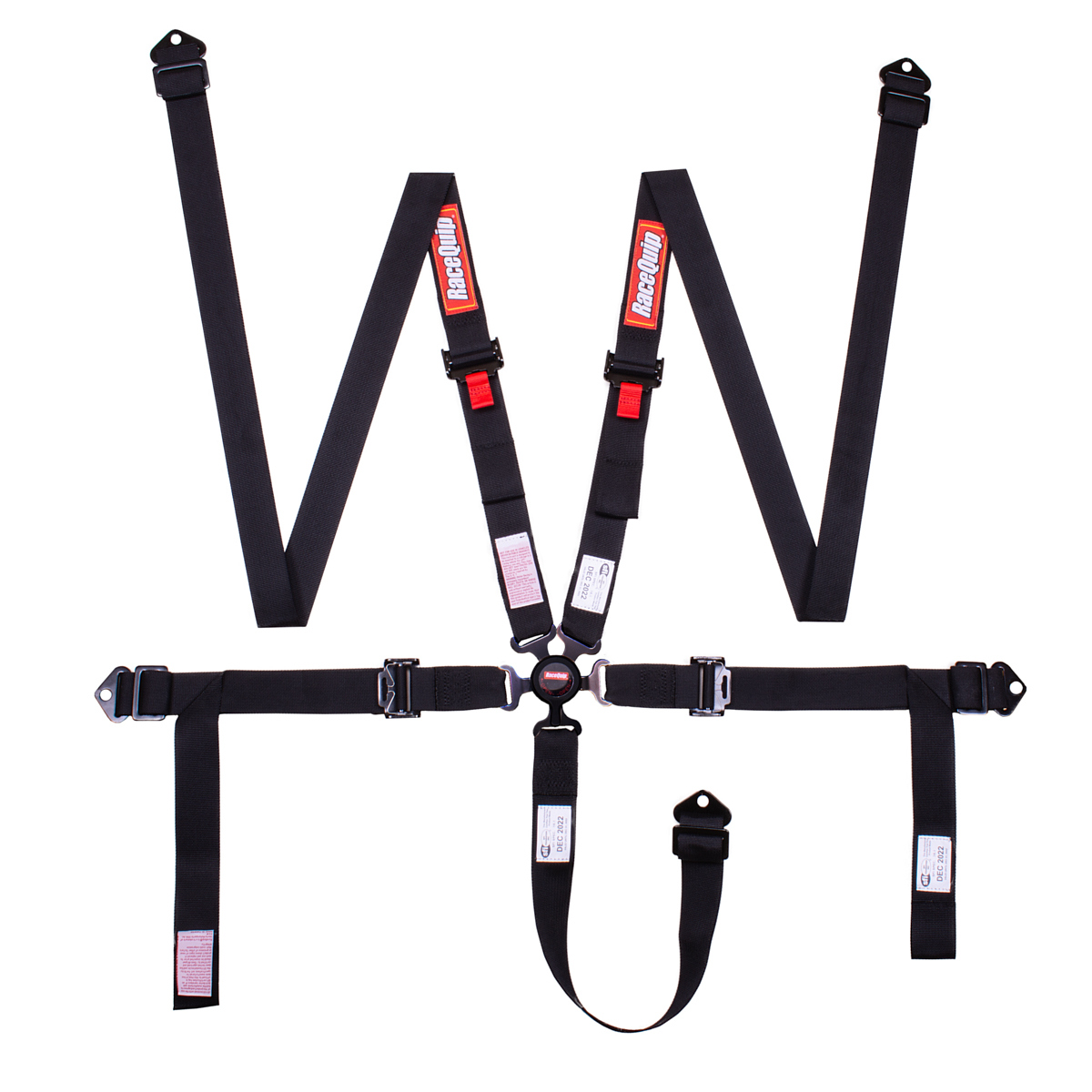 RaceQuip’s 5-Point Camlock Harness System features 2" shoulder and lap belts and carries an SFI 16.1 Rating. The 2" twin individual shoulders allow use with any Head & Neck Restraint Device and the 2" lap belt means that the belt can tuck below your hip bone instead of on top of it. This allows a tighter lap belt and it will load more quickly in the event of an impact. The lightweight aluminum alloy cam buckle provides precise spring pressure for a positive feel when rotating the lever to the 45 degree (right or left) unlatch movement. This motorsports seat belt system also has a "pull down" lap belt design which means you pull the lap belt ends away from the cam buckle to tighten the belts. The cam buckle stays attached to the right side lap belt when not in use. This auto racing harness is manufactured using premium 2" polyester webbing and black epoxy coated drop forged steel 3 bar slides and bolt on hardware ends. The double adjustable ends allow mounting as either wrap around or bolt-in. Shoulders adjust from 25" to 72" and lap belt adjusts from 30" to 70". NOTE: RaceQuip motorsports harness sets and seat belts are NOT D.O.T. / FMVSS 209/302 certified for on highway use. They are only to be used in racing vehicles off of public streets and highways. All racing harness sets are designed to be mounted in a race vehicle to a rollcage or harness bar - if you do not have either, you should not try to install any RaceQuip harness set or seat belts. Available in black with black hardware. One "set" of seat belts equals one seat.