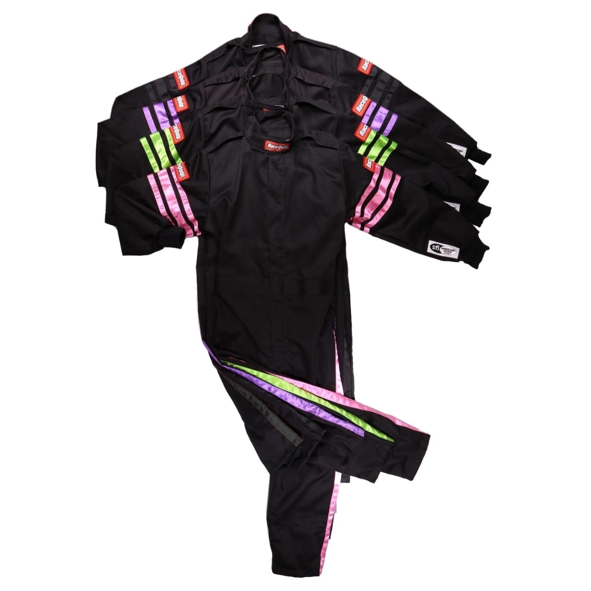 The RaceQuip Youth single-layer SFI-1 racing suit is made from Pyrovatex FRC material. This fire-retardant cotton based (FRC) material is used because it retains the softness and breathability of cotton and will wick away moisture from the skin. Pyrovatex fabric is gentle and non-irritating to even the most sensitive skin. The treatment process leaves the exterior surface shiny and supple. Since the Pyrovatex process combines a chemical agent with the raw cotton fibers to create a bond at the molecular level, with proper care, the suit will retain its flame-retardant properties beyond the useful life of the garment. All racing suits are assembled with heavy-duty, multi-needle, over-lock safety stitch machines to provide exceptional seam strength. RaceQuip suits feature a high-quality heavy duty Nomex backed brass zipper installed with a double overlap for a more secure front opening. Stylish contrasting armband stripes match the full-length leg stripes.