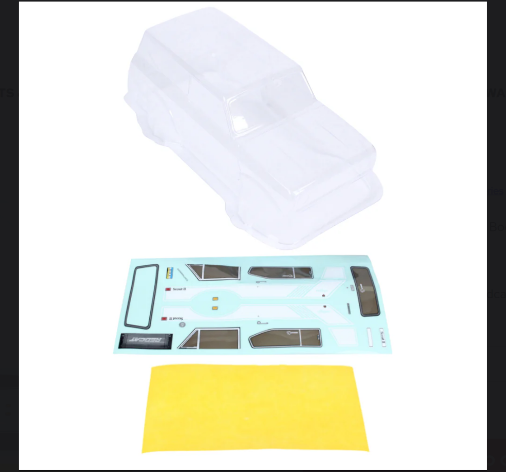 The Redcat Racing RER37875 is a clear, unpainted version of the licensed International Harvester Scout II body. This is the ideal choice for hobbyists who want to create a custom look with their own paint scheme using polycarbonate-safe (Lexan) spray paint. It includes a protective overspray film and window masks to ensure a professional, clean finish.