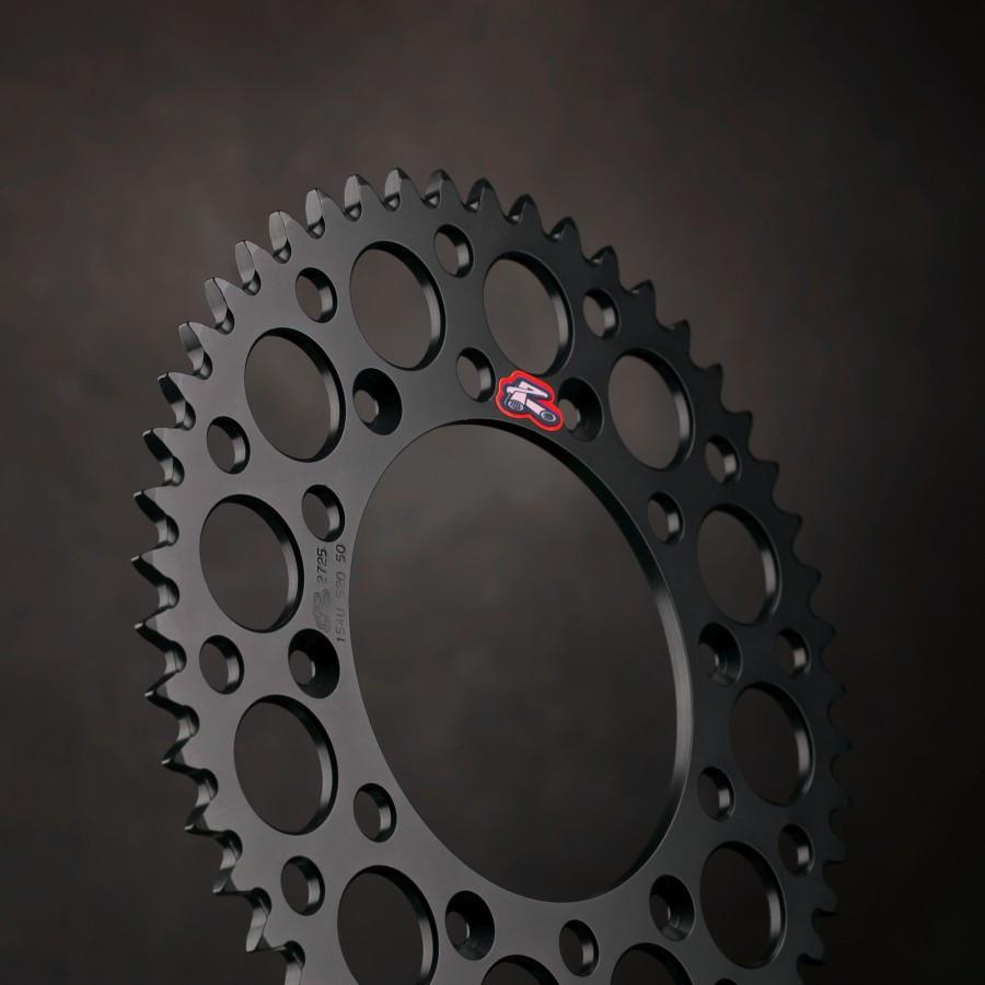 Renthal UltraLight Rear Chainwheels are expertly CNC machined in Manchester, UK, from 7075 T6 aluminum to incredibly tight tolerances, making them 66% lighter than steel alternatives. These chainwheels are computer engineered and tested to ensure precise fitment, concentricity, and load dispersion, with tooth profiling designed to provide maximum power transfer.