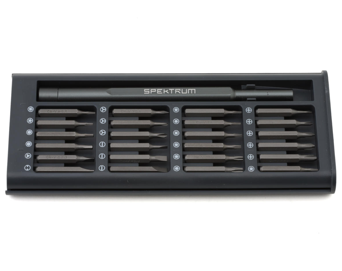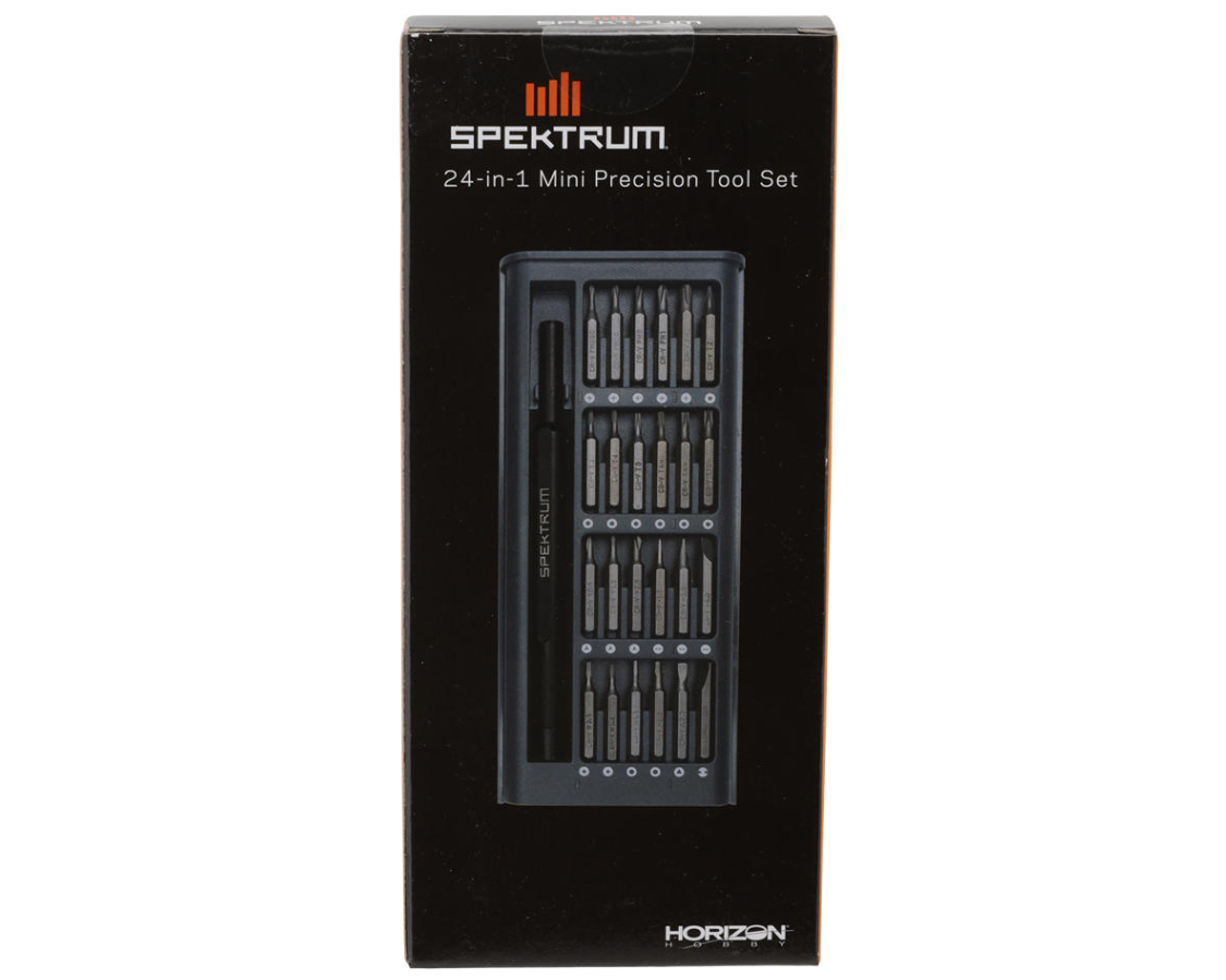 The Spektrum™ 24-in-1 Mini Precision tool Set is a small, compact, and easy-to-transport tool set for use in smaller precision use cases. Includes common Phillips, Flat and Hex style bits and specialized drive tips such as Torx, Y Style and more. Excellent for building and repairing smaller RC models, electronics and micro helis. The bits are made of S2 Steel and magnetically attach to the aluminum storage area.