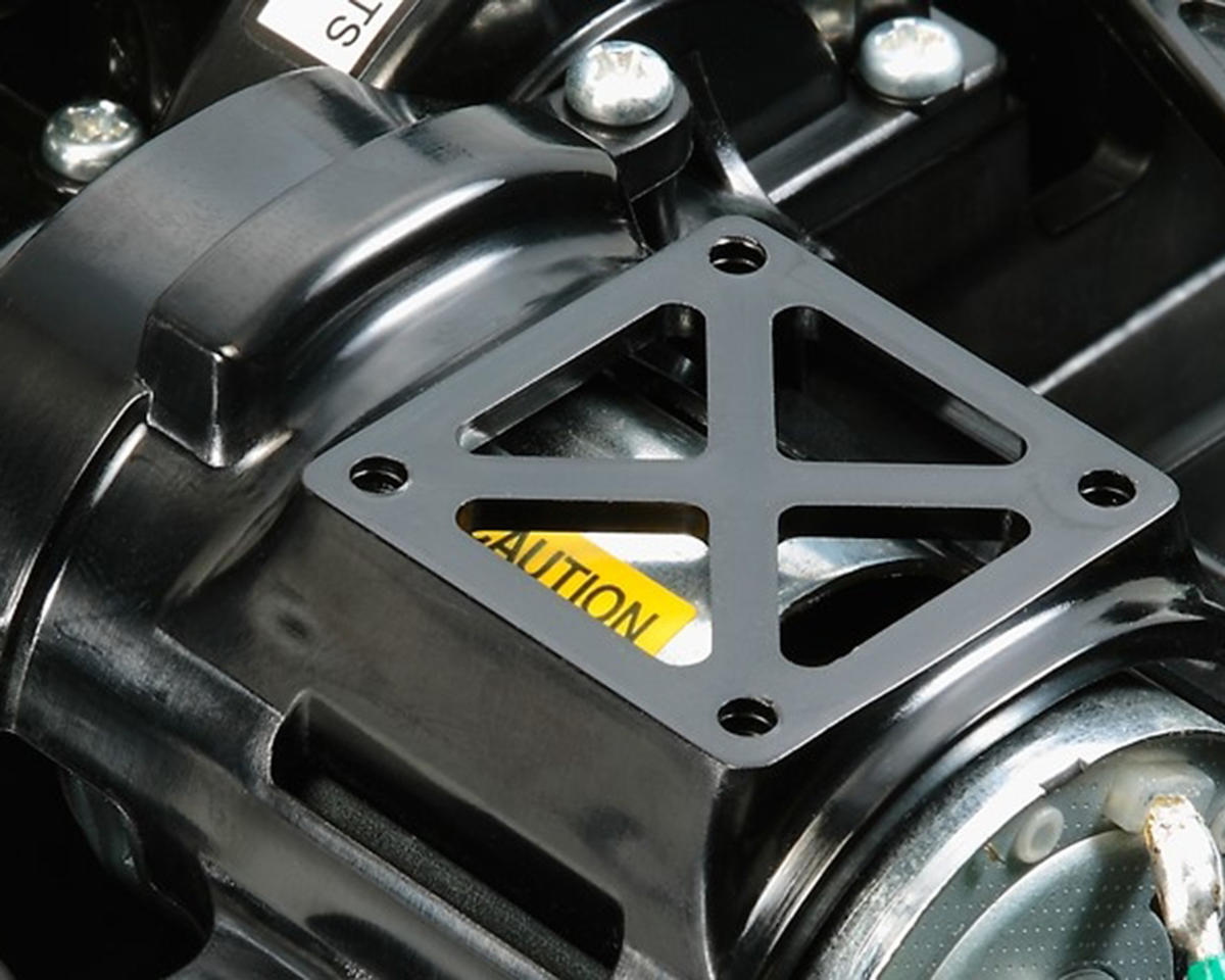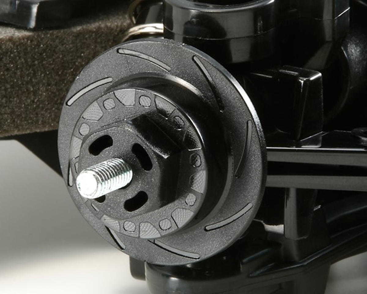 The TT-02 chassis, with its adaptable and balanced shaft-driven 4WD system, ensures excellent stability through a longitudinal layout featuring the battery on the left and the motor on the right. Its design incorporates identical left and right suspension arms and uprights for straightforward assembly, along with easily maintainable gearboxes. The chassis offers versatility with two wheelbases, two ground clearance settings, two tread setups, and a selection of ten gear ratios. Not only functional, it boasts aesthetic appeal with brake disc-shaped wheel hubs, stylish front bumper supports, gun metal color 10-spoke wheels, and sleek slick tires, delivering a sporty appearance.