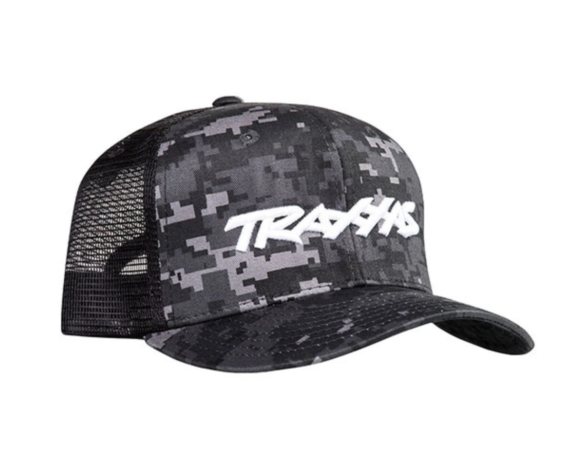 Discover the Traxxas Curved Bill cap in a stylish, patterned black with a striking white logo. This high-quality trucker cap is the perfect accessory for any RC car enthusiast who appreciates both functionality and style.