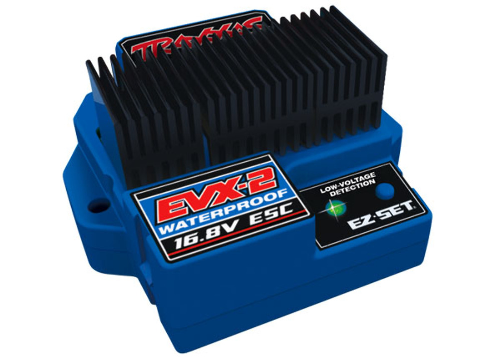 The EVX-2 delivers an incredible 16-plus volts, from two battery packs, making 16.8-volt, twin-motor setups more powerful than ever! Designed by Traxxas, the EVX-2 features a completely waterproof design, three drive profiles, Thermal Shutdown Protection, and gold-plated patented Traxxas High-Current Connectors.