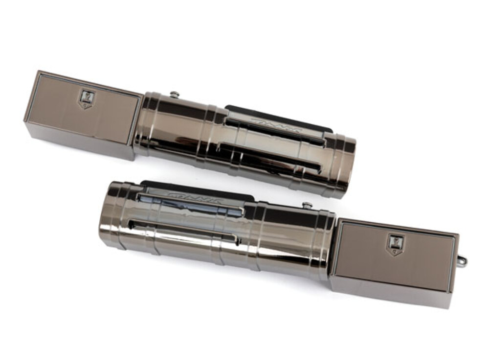 The Traxxas TRX8845 Fuel Tanks and Tool Boxes set provides left and right fuel tanks, two tank mounts, and left and right tool boxes in a tan plastic finish. This robust accessory set is ideal for adding realistic detail and functionality, with clear technical specifications to help planning and installation.