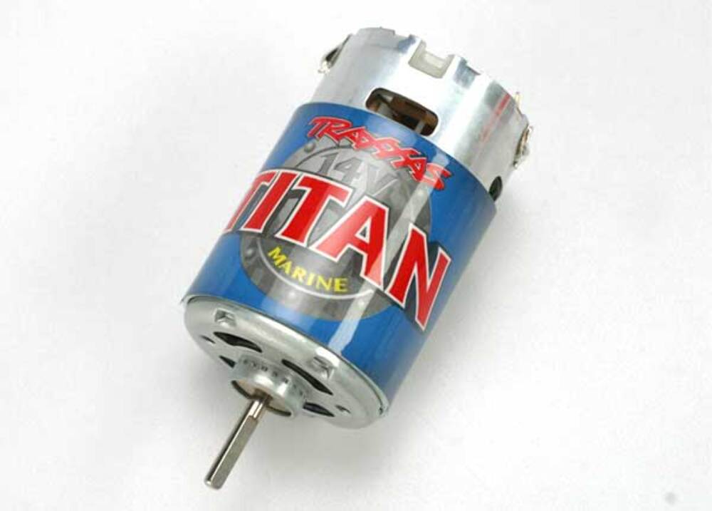 The Titan 550-size marine motor features 24 turns of pure copper for massive torque. Rated up to 14 Volts, the Titan marine motor uses an integrated cooling fan to pull cool air through the motor to keep temperatures down. Motor includes capacitors, but does not come with wires or connectors (requires soldering).