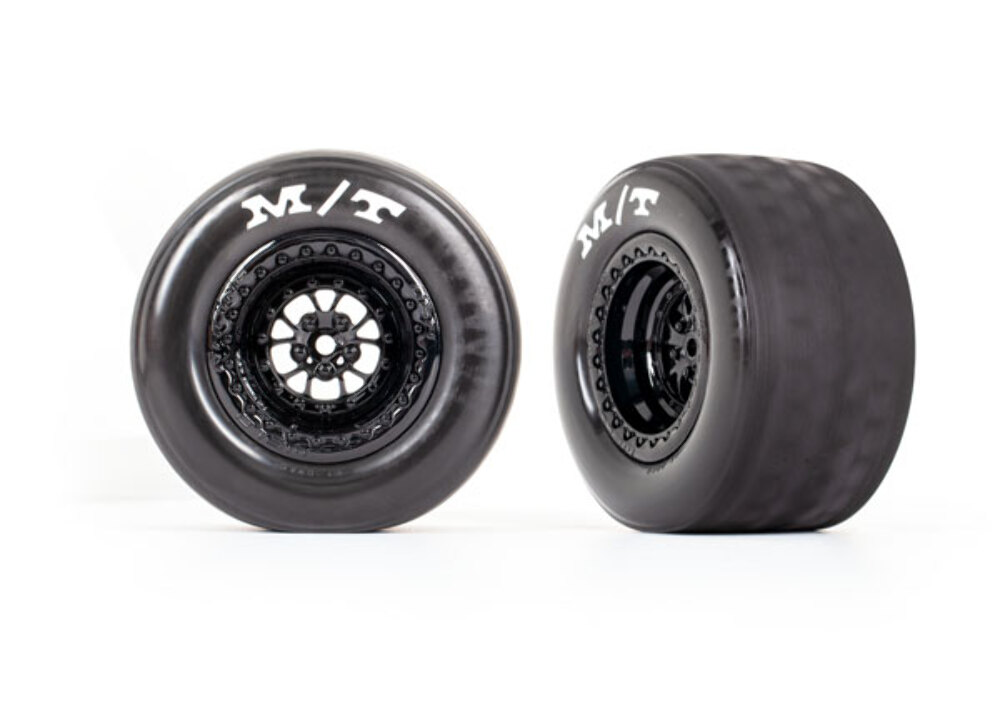 Pair of licensed Mickey Thompson ET Drag drag slicks come pre-glued with foam inserts to gloss black Weld rear wheels. The wide tires unique compound balances long tire life with maximum traction to replicate the legendary look and performance of the real thing.