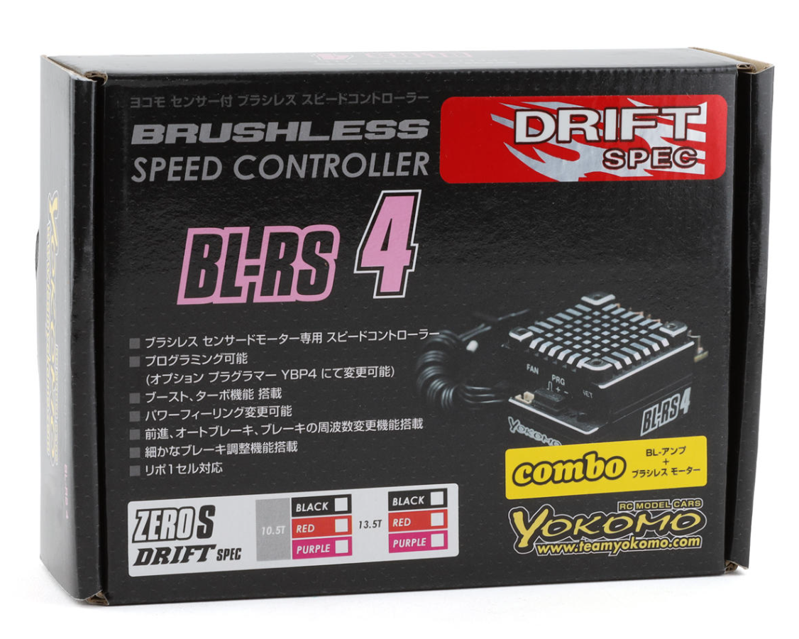 This is the Yokomo BL-RS4 Drift Spec Sensored Brushless Combo. This combo combines the excellent throttle control of the BL-RS4 ESC with the consistent power of the ZERO-S Drift motor. The RS4D is a full aluminum case ESC developed in cooperation with Yokomo's Takashiro. This ESC is great for 2WD and 4WD and features drift specific programming. In order to make it easier to control the drift angle during cornering, the throttle characteristics in the low speed range are set to mild, while the middle speed range has a little boost to produce powerful turning.