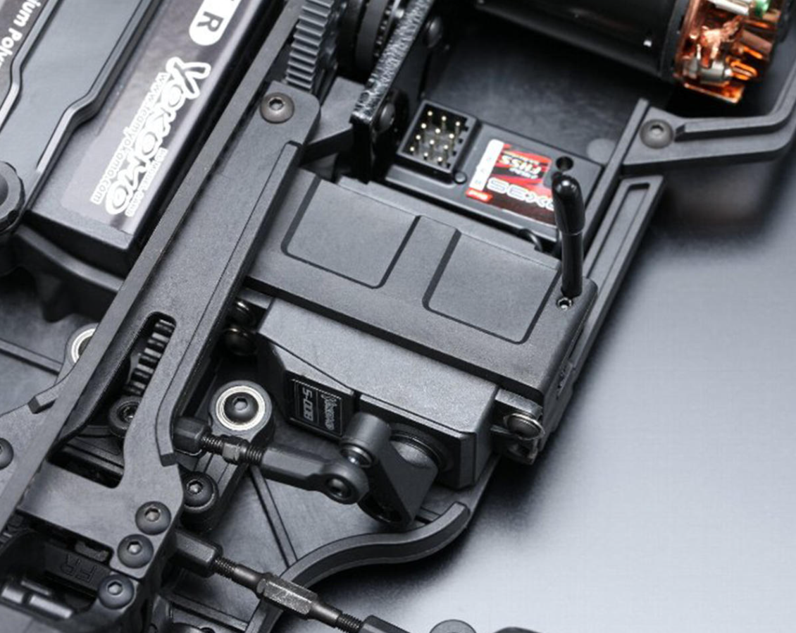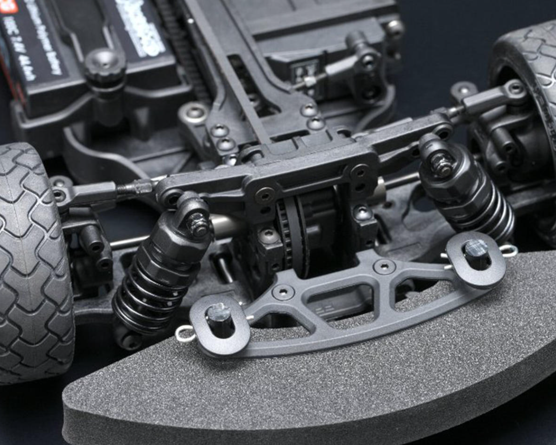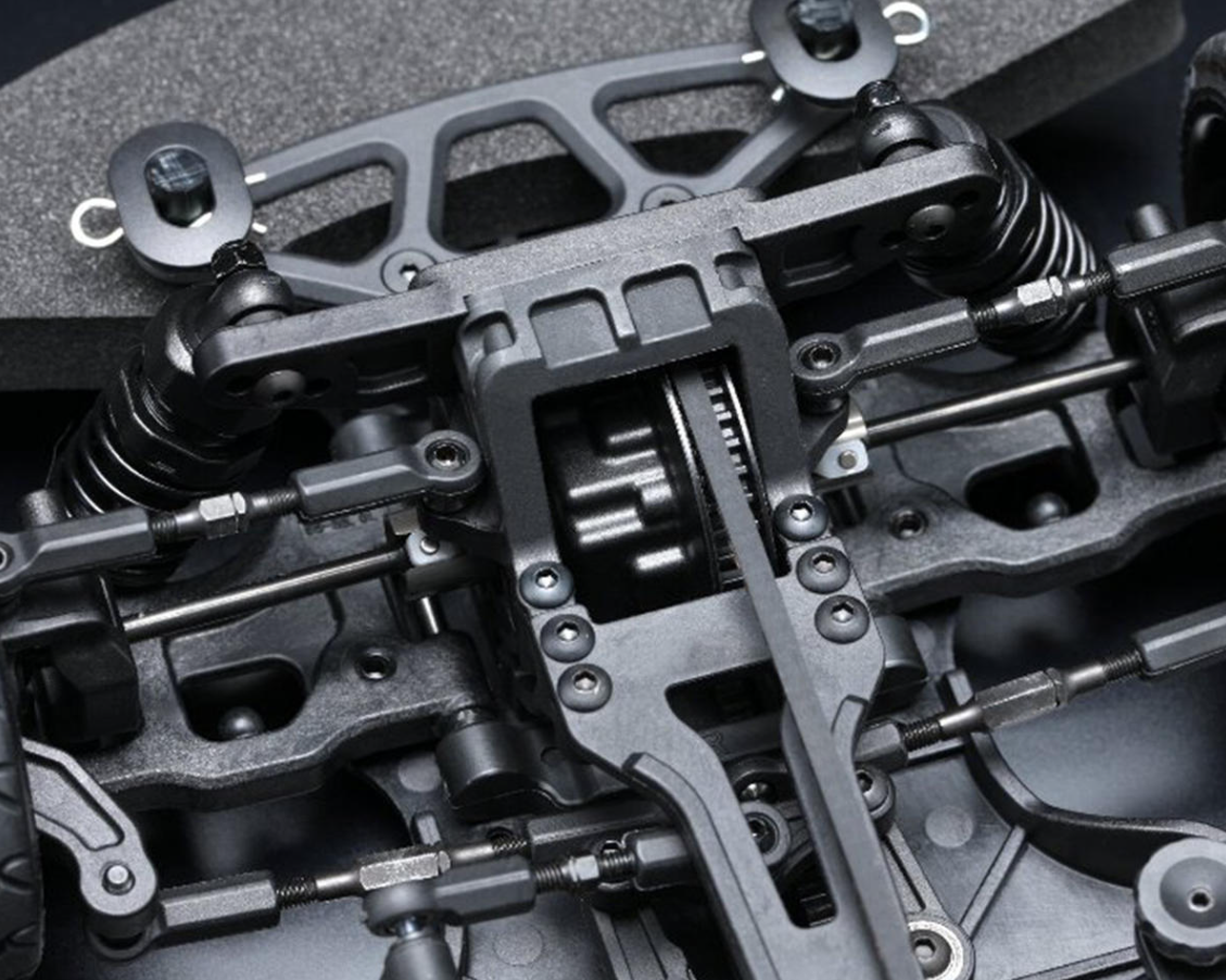 The shocks and suspension system of the RS2.0 is designed to elevate handling performance. The inclusion of short oil-filled shocks, combined with lower shock towers, drastically reduces the vehicle's center of gravity, leading to enhanced stability and improved maneuverability. These shorter shocks provide precise control, and their compatibility with competition-level springs opens up a wide range of tuning possibilities. The double-wishbone suspension on both the front and rear absorbs road surface impacts, delivering a smooth, composed ride. The turnbuckle upper arms and tie rods make it easy to adjust camber and toe-in, offering fine-tuning capabilities for competitive racing. This combination of high-end shock and suspension components ensures the RS2.0 is capable of delivering a competitive edge on the track, with plenty of upgrade potential as skills improve.