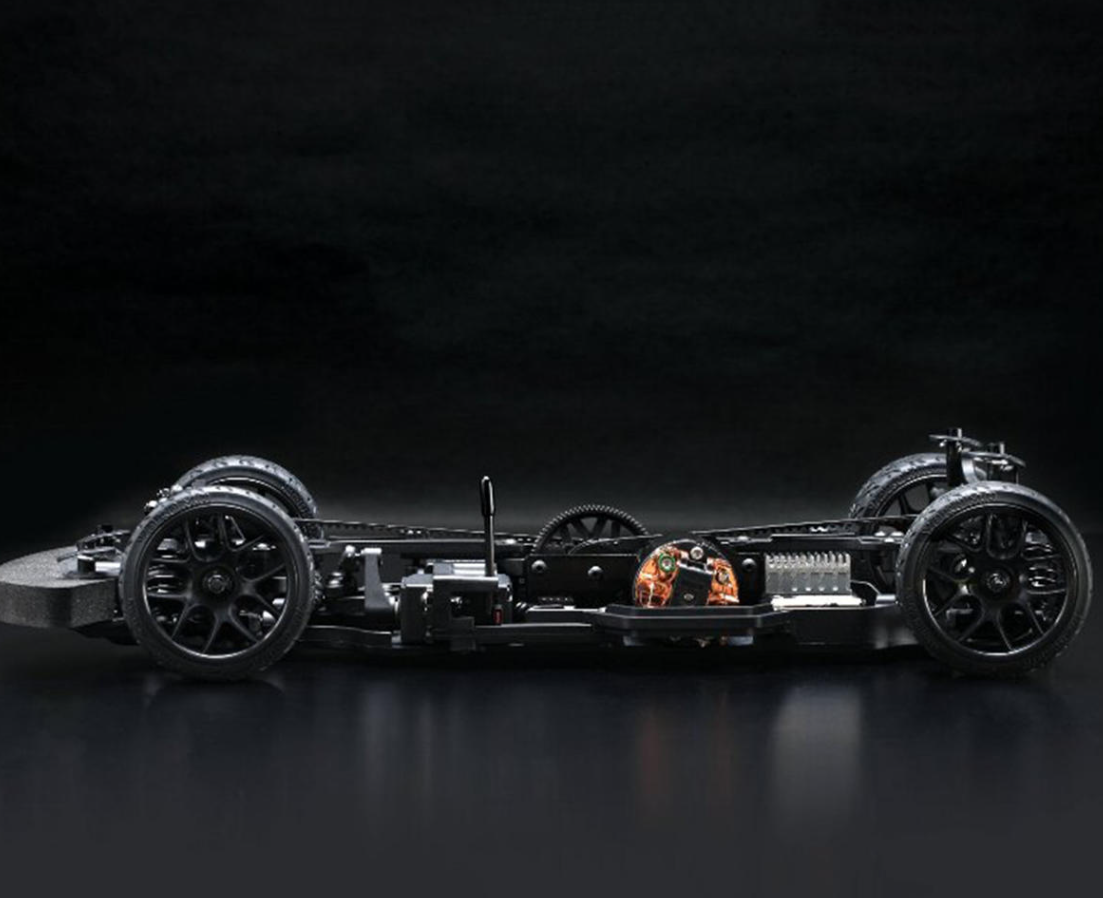 The drivetrain of the RS2.0 is finely tuned for balanced performance, thanks to its two-belt system featuring equal-length front and rear belts. This setup creates a stable, responsive driving experience with minimal disturbances during throttle inputs, resulting in smoother cornering. Both the front and rear drives utilize gear differentials, with the rear incorporating an oil-filled, sealed differential case. This allows for the tuning of driving characteristics by adjusting the oil viscosity, granting racers the ability to optimize handling for specific track conditions. Universal drive shafts ensure consistent drive efficiency, even when the suspension is engaged or steering at sharp angles, making the RS2.0 remarkably easy to control, even for novice drivers.
