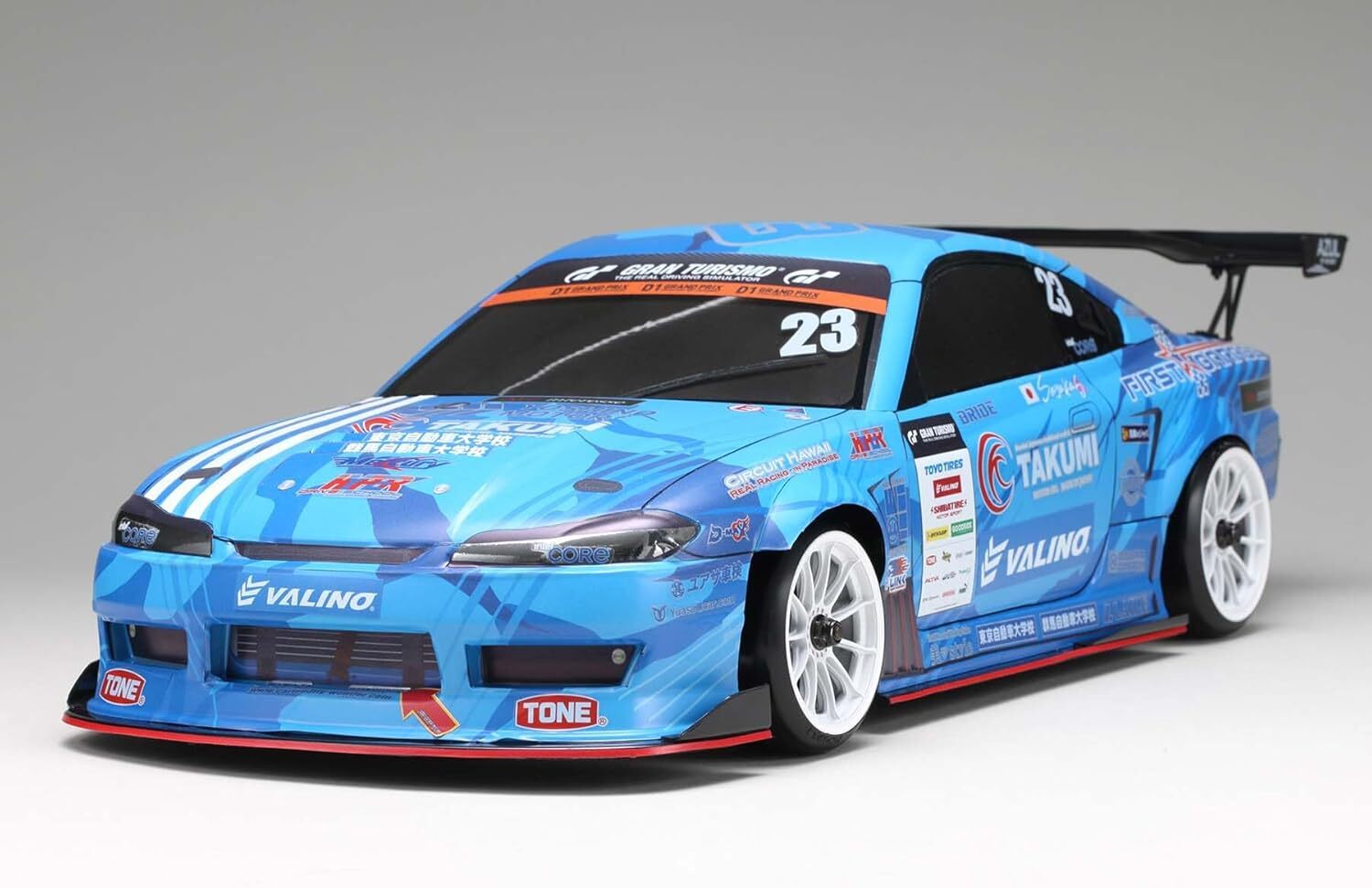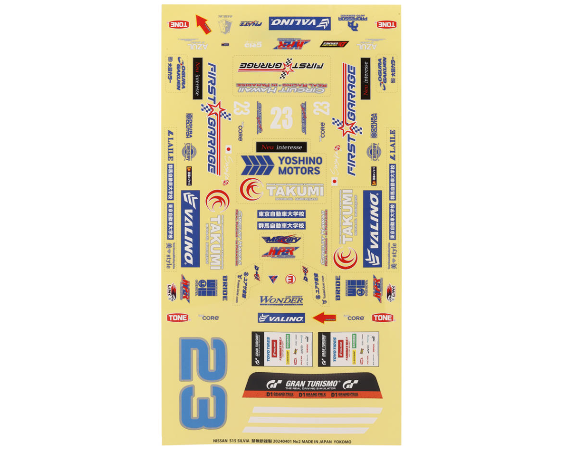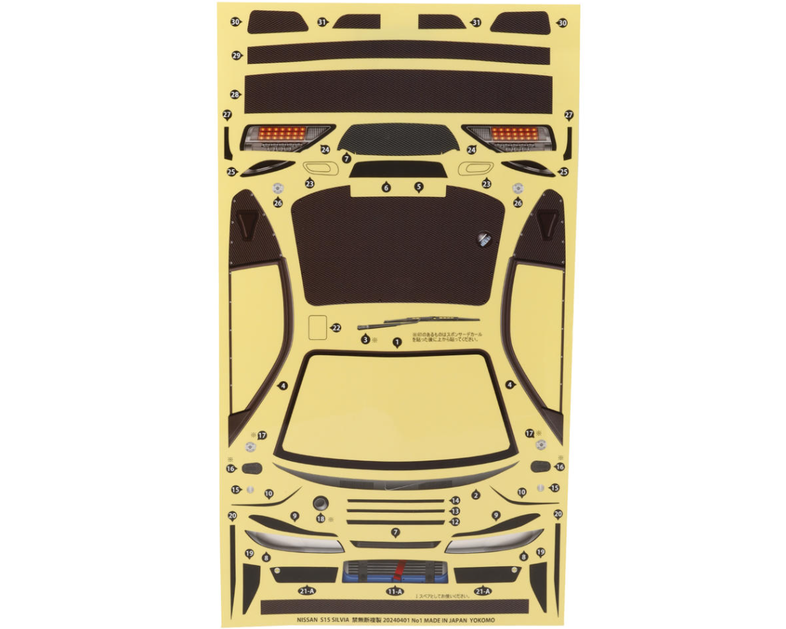 okomo MERCURY SAYAKA Special S15 Drift Body Set. The MERCURY SAYAKA SPECIAL S15 is a detailed drift car body modeled after the vehicle driven by popular Japanese driver Sayaka Shimoda. This design is characterized by its wide form with over fenders and a distinctive GT wing, contributing to a racy and aggressive look. The body is designed to fit competition drift chassis with a wheelbase of 255mm, enhancing both aesthetic appeal and performance on the track. Package includes one body and two decal sheets.